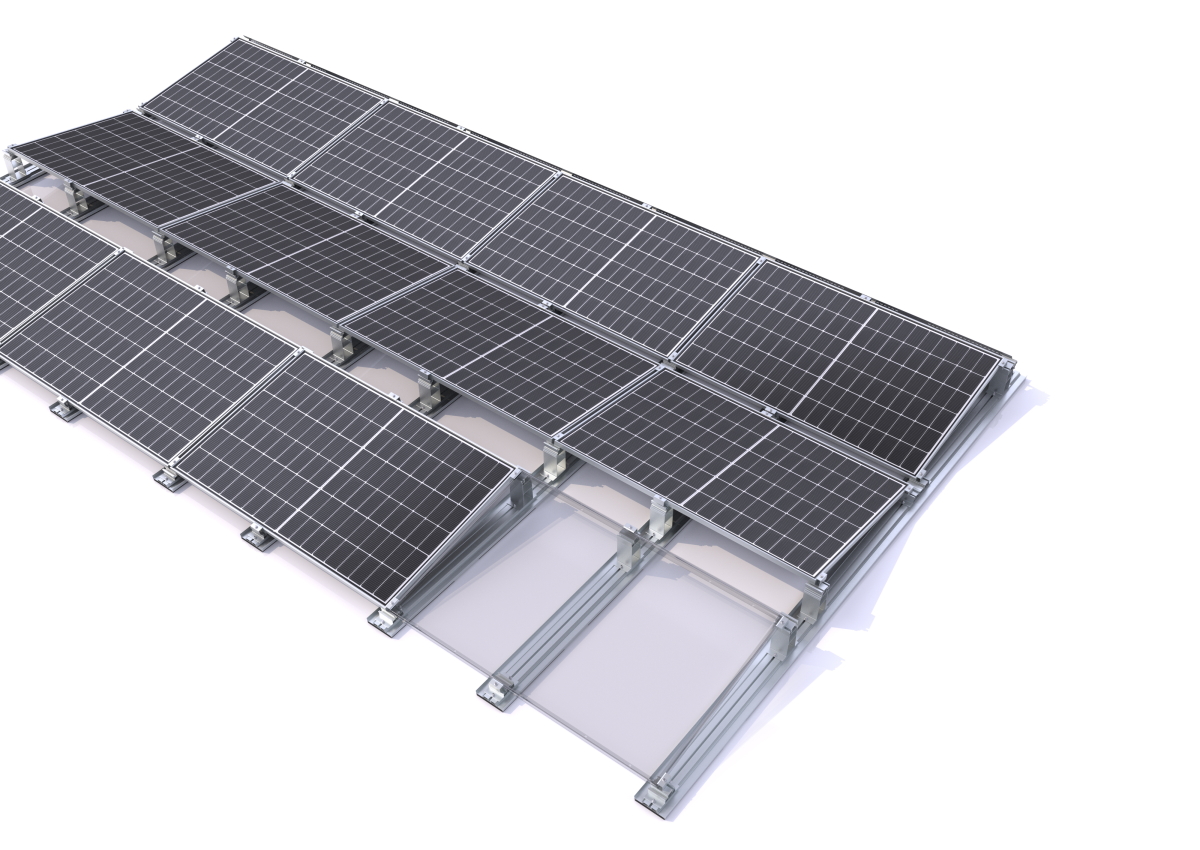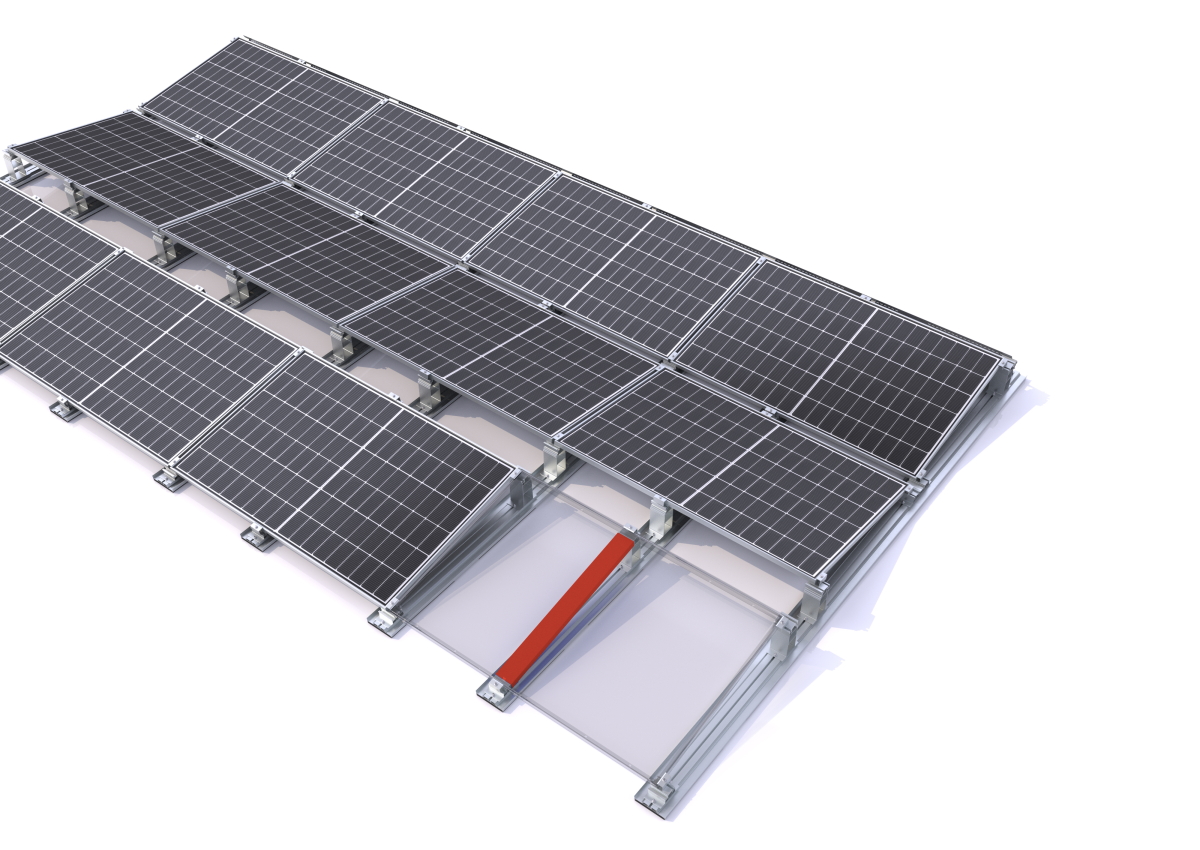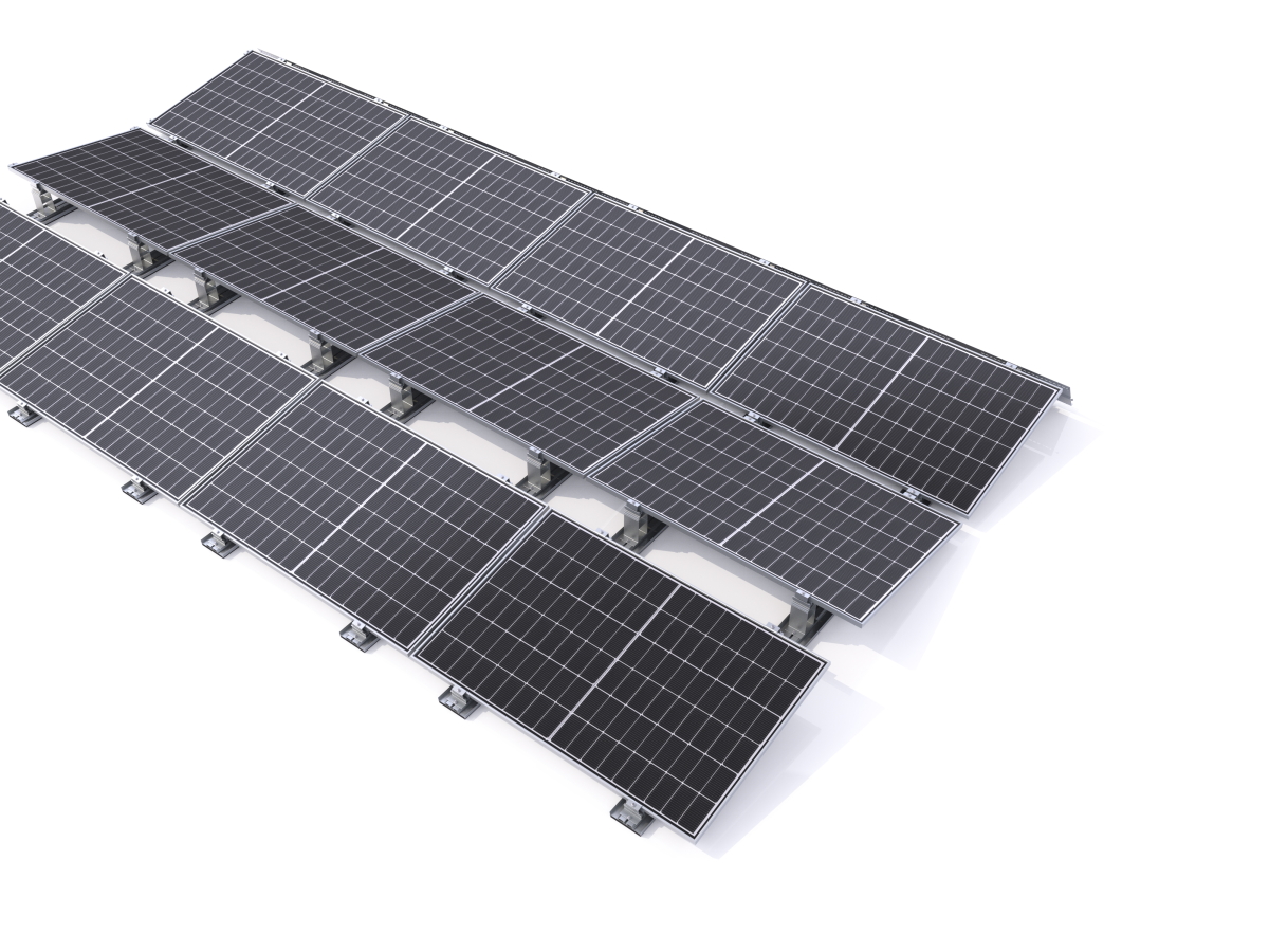 Zorgt voor extra stabiliteit met steunen en klemmen op de module. Voordelen: ondersteuning van de lastverdeling, vermindering van de oppervlakte druk op de isolatie, verhoging van het draagvermogen en weerstand tegen wind- en sneeuwlasten. Veiligheidsvoordeel bij grotere modules en veeleisende dakomstandigheden.